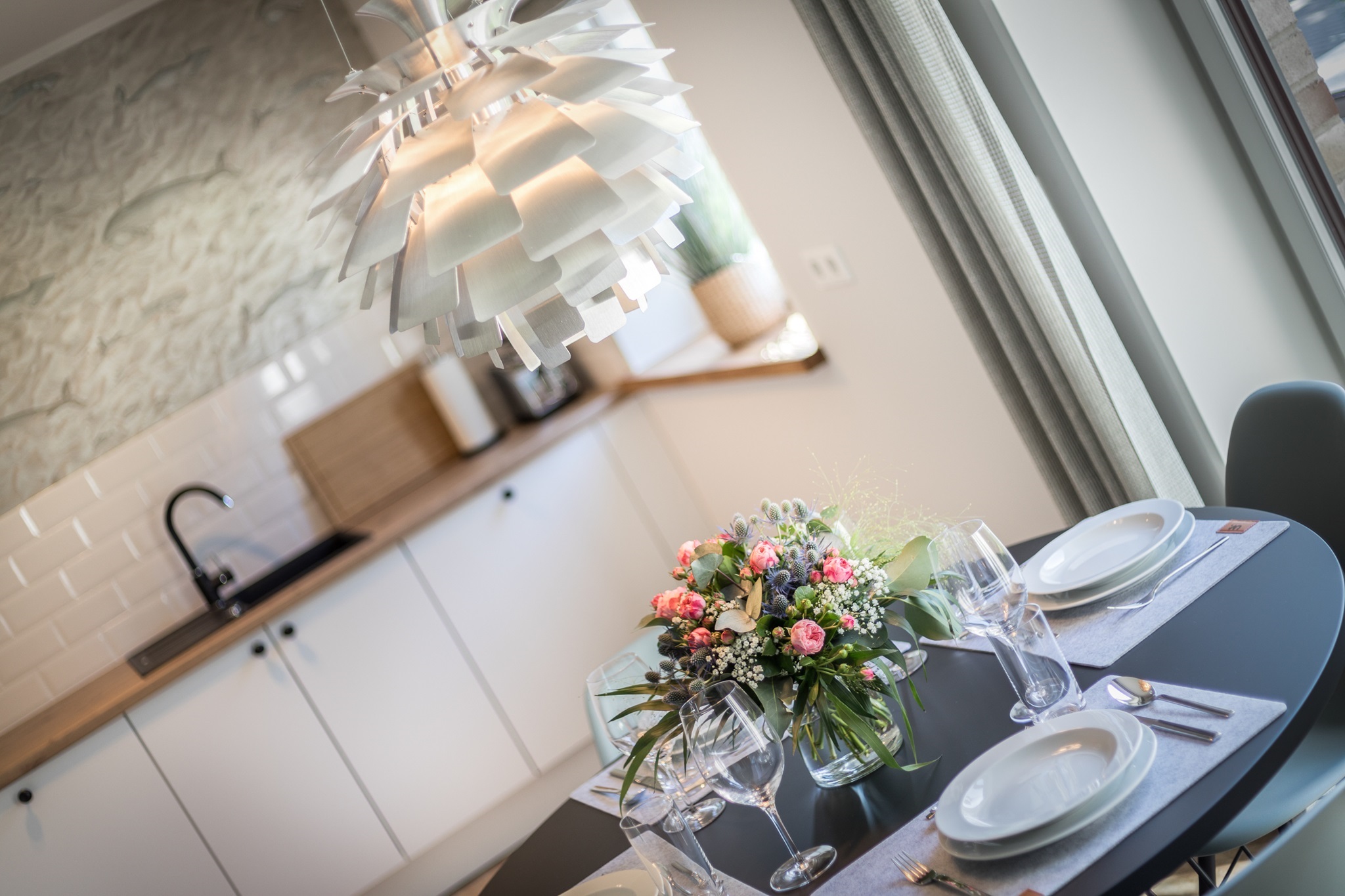 Die offene Küche ist sehr hochwertig ausgestattet. Geschirrspüler, Induktionsherd, Backofen, Mikrowelle, Kaffee- und Kaffeepadmaschine uvm. stehen zu Ihrer Verfügung.