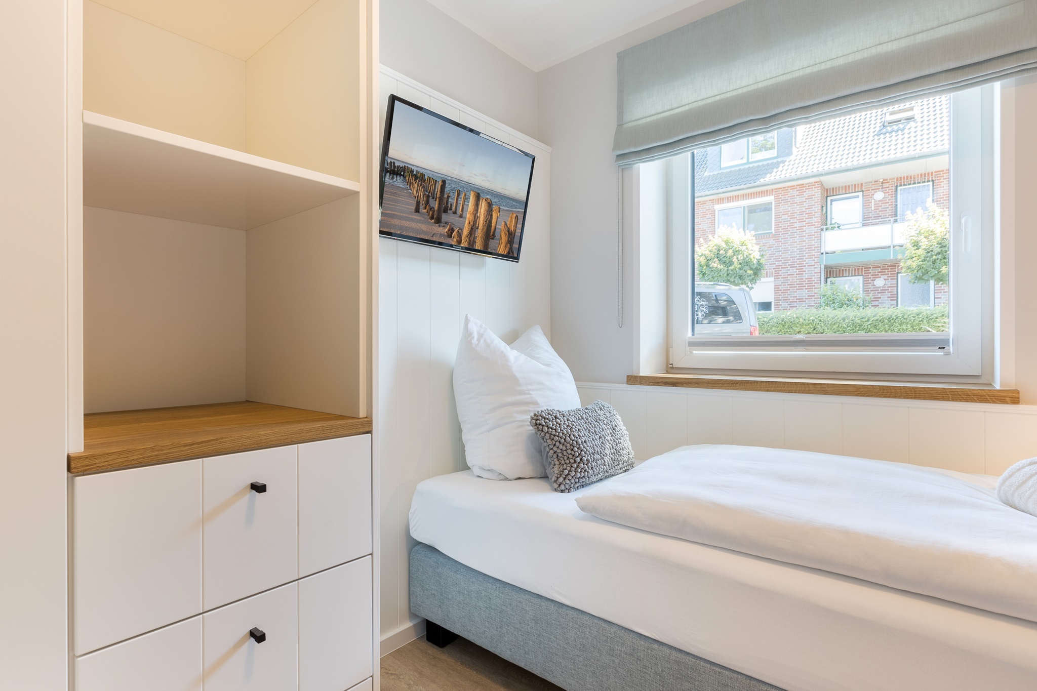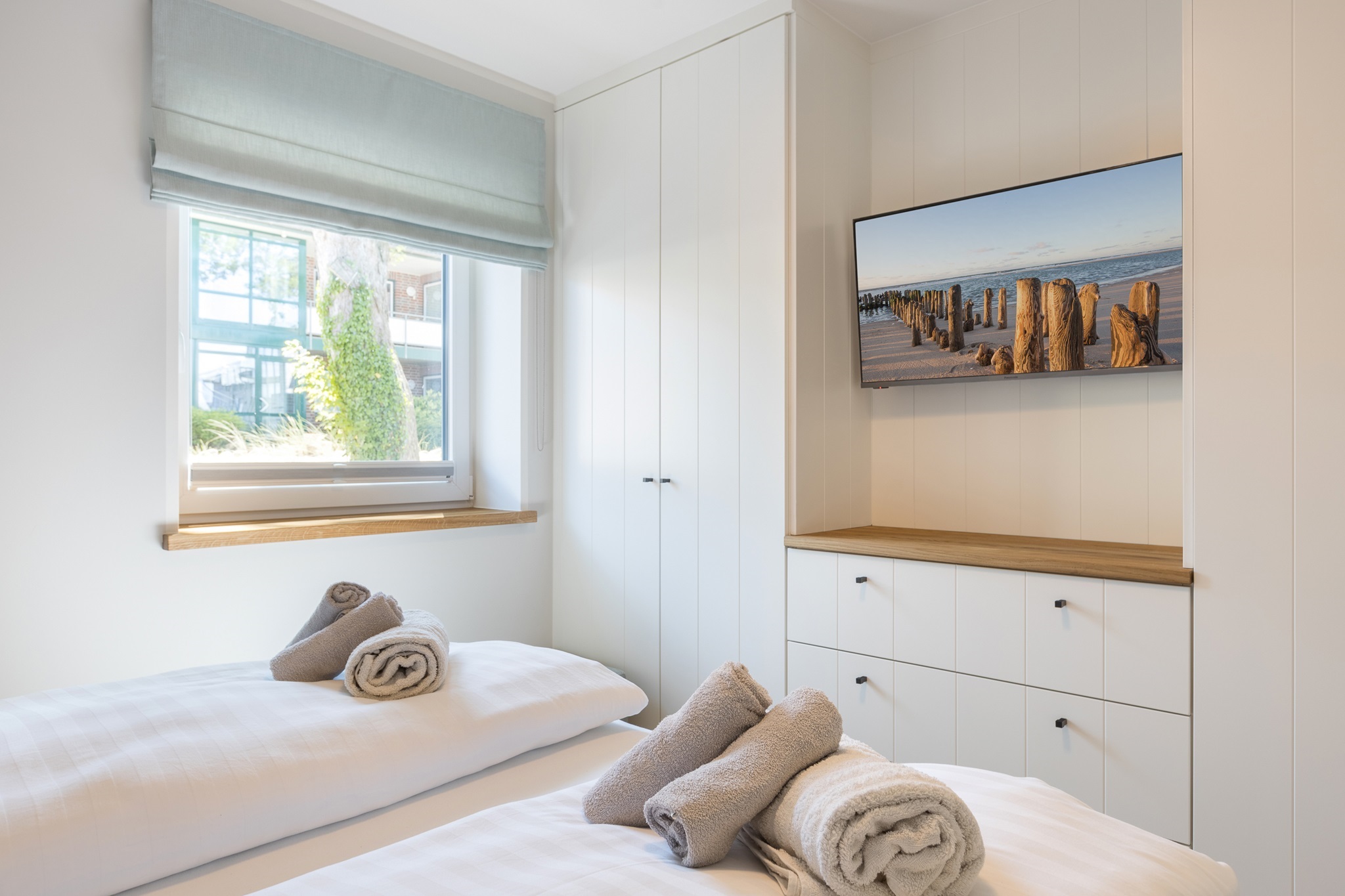 Die großzügigen Schlafräume verfügen ebenfalls über Flatscreen-TV. Ein Babyreisebett kann dazugestellt werden.